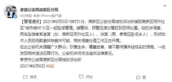 孝感市公安局高新区分局城东派出所6月6日通报,6月5日18时51分,高新区公安分局城东派出所接到高新区同升社区“城市绿洲”小区一起坠楼警情。接警后,民警迅速出警赶到现场处置。经初步调查,两名坠楼者系李某(女,高新区同升社区人)、涂某(男,孝南区卧龙乡人),刑侦技术人员现场勘查